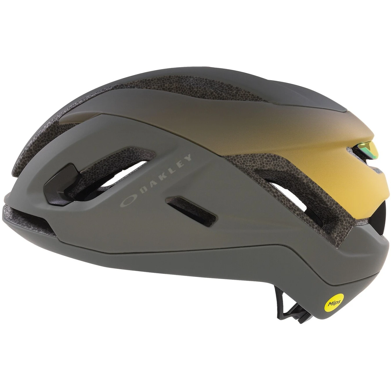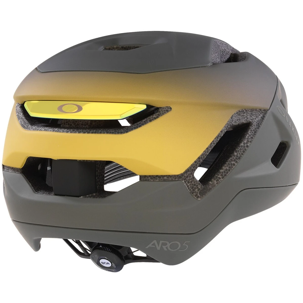 De ARO5 Race heeft een branding badge met een Iiridium® coating die de Prizm™ lenskleuren van Oakley brillen weerspiegelt. Elke kleur van de badge is uniek voor de kleur van de helm, waarmee de Oakley brillen traditie wordt gevierd.